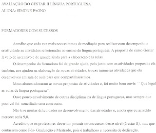 O Gestar II foi, para mim, um dos maiores desafios como profissional do Magistério. No começo, expectativa, medo... muito medo ... porém com o apoio e o conhecimento da minha formadora Tamar Rabelo, aprendi muito e senti-me segura . O material do Gestar é muito bom e busquei outras fontes para enriquecer as oficinas, além das ideias que surgiram nos momentos de estudo e planejamento das oficinas. Foi uma formação diferenciada, pois trouxe a teoria aliada a prática. Isso era o que buscávamos a muito tempo. Esta formação permitiu aos professores desenvolverem atividades com seus alunos, analisando os resultados, socializando com o grupo e buscando formas de intervir nos problemas detectados para melhorar o desempenho dos alunos na leitura, na oralidade e na escrita. Durante este tempo de formação pude aprender muito e contribuir com meus cursistas, procurando estimulá-los, tirando suas dúvidas e dando sugestões, pois acredito no potencial de cada educador.